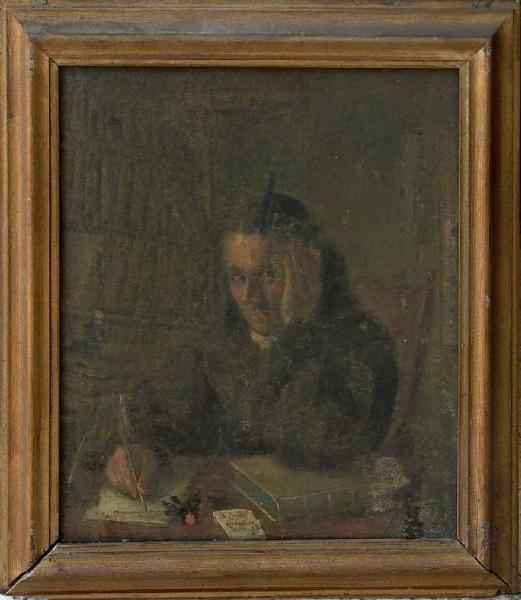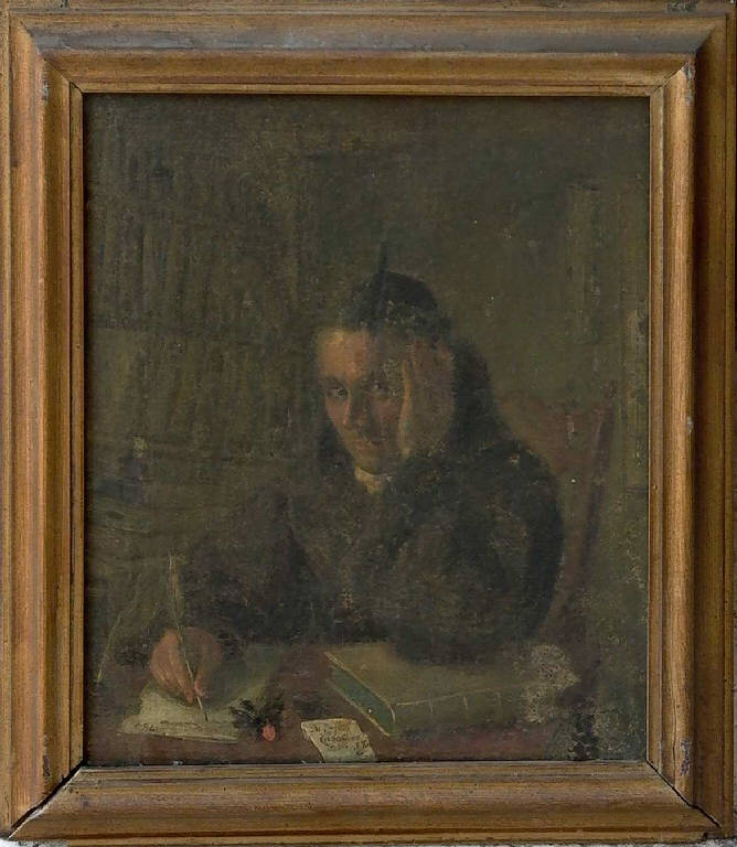 - NOTIZIE STORICO CRITICHE Il cattivo stato di conservazione del piccolo ritratto del francescano Gioachino Trioli (1735-1799) non permette di avanzare ipotesi attributive. L'uomo, in abito religioso, è raffigurato pensoso, intento a scrivere su alcune carte; l'ambientazione è quella di uno studio fitto di libri. Quasi certamente il dipinto è stato realizzato nel periodo del soggiorno clarense del francescano, attorno agli anni Sessanta del Settecento, come dimostra anche l'età apparente del ritrattato. Il quadro era di proprietà dell'Ospedale Mellino Mellini di Chiari; è entrato in Pinacoteca prima del 1918, anno del primo inventario in cui tale opera compare.