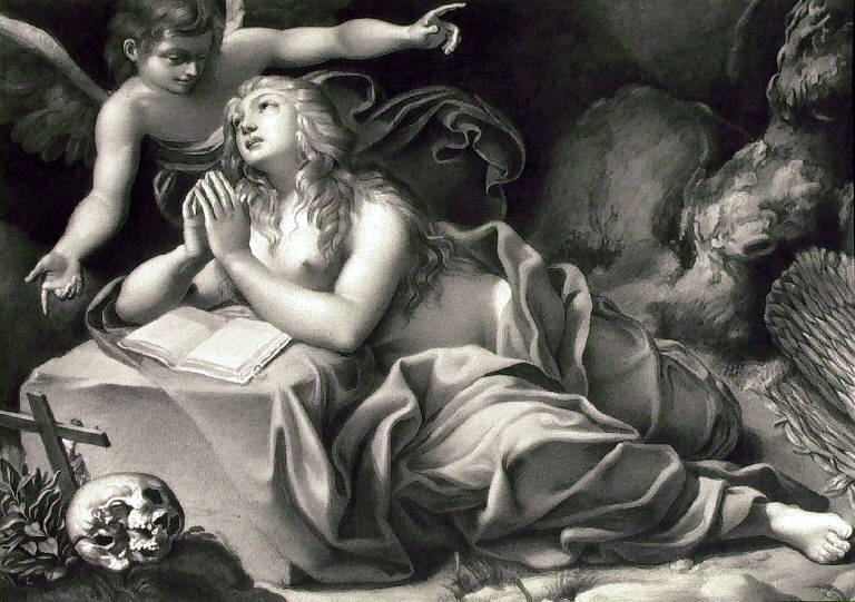 La figura della Maddalena occupa tutto il campo compositivo poichè appare semisdraiata da sinistra a destra; le braccia sono appoggiate ad una pietra squadrata e parzialmente coperta dal manto della Maddalena stessa e su di essa si trova un libro aperto; le mani sono giunte e lo sguardo è rivolto, supplice, ad un angelo che le parla; in basso a sinistra ci sono il crocifisso e il teschio.
