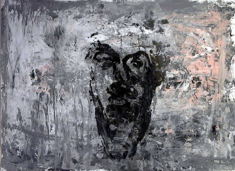 Al centro del campo pittorico si trova un volto umano, probabilmente maschile, i cui contorni si perdono nel colore grigio dello sfondo.