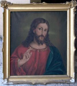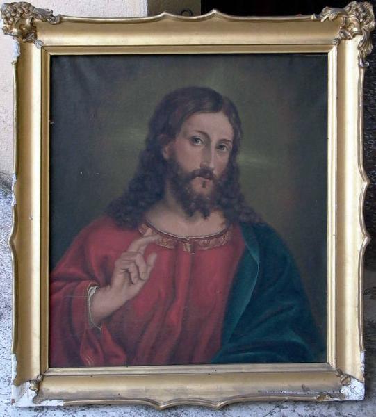 - NOTIZIE STORICO CRITICHE Riconoscibile nel numero 4 della Distinta nella quale erano elencati i beni artistici lasciati dal defunto avvocato Pietro Bartolomeo Repossi nel 1854, il dipinto è descritto come "Testa del Salvatore con cornice dorata ed ornati a pastello". Presente fin dal 1878 negli inventari della Pinacoteca Morcelli è stato riconosciuto parte del lascito Repossi da Maggi. Il Cristo, raffigurato a mezzo busto e in atteggiamento benedicente, riprende prototipi veneti (non solo dei citati Marco Basaiti e Giovanni Bellini citati da Maggi), da Tiziano a Rocco Marconi, in specie desumendo la tipologia da un noto dipinto, più volte replicato, raffigurante Cristo e l'adultera. Non di meno la fortuna del prototipo veneto è testimoniata da molte riprese in ambito italiano. Il dipinto in oggetto mostra caratteri stilistici fortemente accademici la cui persistenza va ben oltre la metà dell'Ottocento; questo pare motivare anche la datazione tarda (tra la fine del XIX e l'inizio del XX) attribuita dal catalogo della Pinacoteca Repossi.