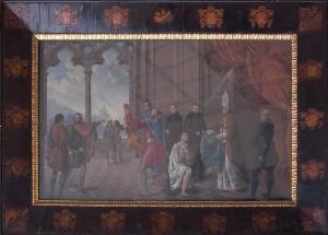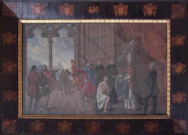 - NOTIZIE STORICO CRITICHE Nella Distinta dove, nel 1854, si elencavano i beni artistici lasciati dal defunto avvocato Pietro Bartolomeo Repossi, il dipinto è descritto come "Fatto storico di un Vescovo con cornice intarsiata con emblemi vescovili e di religione, due copie simili" ed è, insieme al suo pendant (D000112) segnato al n. 1. Negli inventari successivi il tema è meglio precisato, riconoscendo in esso l'episodio della rinuncia alle ricchezze da parte di san Francesco d'Assisi. La qualità abbastanza mediocre della tela aveva spinto i conservatori della biblioteca a sovrapporvi due stampe del Mantegna. La giustificazione, già nell'inventario del 1902, è che la tela e il suo pendant erano orribili, giudizio ribadito anche negli inventari successivi. Di fatto l'elemento più pregevole è la cornice intarsiata sulla quale è ripetuto come motivo ricorrente uno stemma vescovile e, al centro in alto è riprodotto lo stemma dei francescani. Questo motiverebbe anche la scena descritta dal dipinto, ovvero la rinuncia agli averi da parte di san Francesco. L'episodio è immaginato in un palazzo solenne, rischiarato da una grande bifora di sapore eclettico. Il santo è inginocchiato davanti al vescovo che cerca di ricoprirlo con un panno blu mentre il padre si volge dalla parte opposta nostrando agli astanti un panno prezioso. L'esatta rispondenza tra questo dipinto e il suo pendant che differisce solo per piccolissimi particolari e per il colore blu del panno tenuto tra le mani dal vescovo, ha fatto pensare che si trattase di due bozzetti realizzati da un ignoto artista di non eccelse capacità. Maggi (2003-2004, p. 113) ha ipotizzato che potessero essere ascritte alla mano dello stesso Repossi che si dilettava di pittura, sebbene non si sappia con quali risultati. In tal senso la proposta rimane un'ipotesi in attesa di verifica se mai sarà possibile identificare qualche dipinto certo dell'avvocato benefattore.