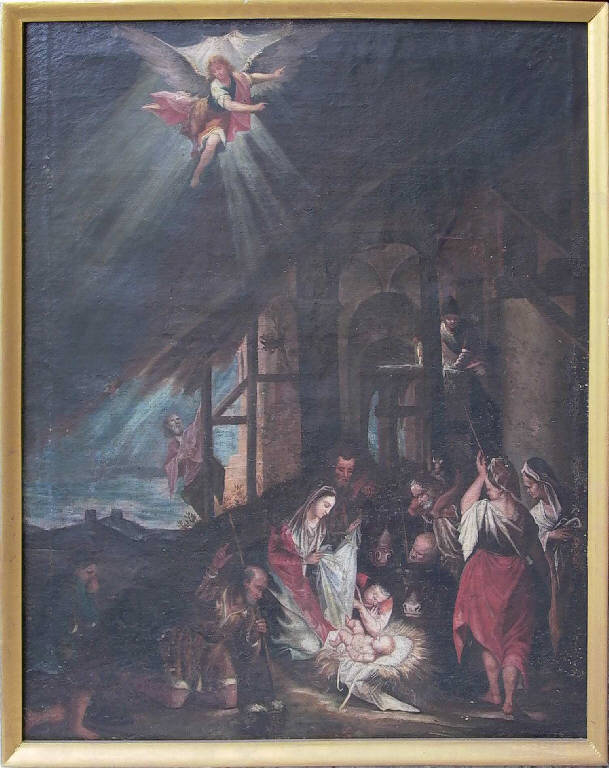 Nella parte destra del quadro si trova una capanna di fronte alla quale sono riuniti la sacra famiglia ed i pastori in adorazione del Bambino; in cielo un angelo.