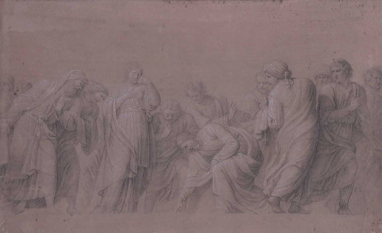 - NOTIZIE STORICO CRITICHE La decorazione della parrocchiale di Provezze, come ha accertato Bedoschi (2000-2001, p. 104), risale agli anni 1828-1830. Nella chiesa l'artista realizzò alcune medaglie ad affresco raffiguranti episodi del Vangelo tra i quali, nella seconda campata della navata centrale, Cristo e l'adultera, tratto dal Vangelo di san Giovanni. Il disegno conservato nella Pinacoteca Repossi è da considerarsi il bozzetto definitivo per tale composizione; il taglio prospettico fortemente scorciato è motivato dalla posizione dell'affresco che non impedisce, però, all'artista di tradurre con efficacia il segno enfatico di Cristo che, piegato a terra, sta scrivendo (e non, come afferma Terraroli, raccogliendo una pietra), concentrandosi perciò sull'istante di massima tensione del racconto. Le figure, dotate di forte senso plastico, sono delineate nel disegno attraverso tratti decisi, sottolineati da interventi ad acquerello e a biacca. I caratteri della grammatica neoclassica sono ben visibili nella costruzione a bassorilievo della scena e nella costruzione quasi simmetrica dell'insieme. Come ha notato ancora Bedoschi (2000-2001, p. 104), i personaggi con il turbante e le figure femminili di questa scena sono ripresi in parte dall'affresco con la Risurrezione di Lazzaro, compiuto dall'artista nel 1807-1808 nella parrocchiale di Provaglio d'Iseo.
