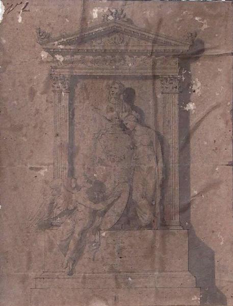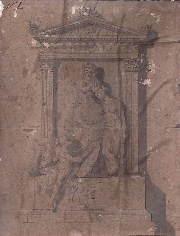 - NOTIZIE STORICO CRITICHE Come ha chiarito Maggi, sulla base dei documenti conservati presso l'archivio comunale di Chiari, i progetti approntati da Teosa per l'erigendo monumento a Stefano Antonio Morcelli non vennero realizzati a seguito di un concorso che sarebbe stato indetto nel 1825, come affermato da Rivetti (seguito da tutti gli altri storici), ma già nel 1821, a seguito della richiesta fatta al Teosa da parte della Deputazione comunale, della Fabbriceria Parrocchiale e della Congregazione di Carità di Chiari, interessate all'opera, al fine di determinare il luogo ove porre il monumento. Il 16 febbraio 1822 i disegni del Teosa, insieme a due bozzetti presentati da Luigi Donegani, erano nelle mani della Commissione che li accantonava in favore dell'ambizioso progetto di affidare la realizzazione di un busto del Morcelli ad Antonio Canova, che non fu tuttavia realizzato per la morte dell'artista. La questione, arenatasi per due anni, fu ripresa dal canonico Gaetano Calvi che rispolverava i progetti di Teosa e Donegani; per la realizzazione si prendevano contatti con Thorvaldsen, quindi con il milanese Pompeo Marchesi, fino alla commissione, quasi a sorpresa, a Gaetano Monti ottenuta attraverso l'intermediazione di Pietro Bartolomeo Repossi. Vincolato dalla necessità di realizzare un monumento a parete Teosa propone in questo disegno una soluzione con edicola classica e due figure allegoriche poste accanto al busto commemorativo del prevosto Morcelli. Non è da escludere, sulla base di questo disegno, che l'intervento del Canova dovesse tradurre (e non sostituire) il progetto teosano che qui, come in un altro disegno, propone la soluzione con il busto del prevosto anziché l'effigie a basso rilievo o a figura intera.