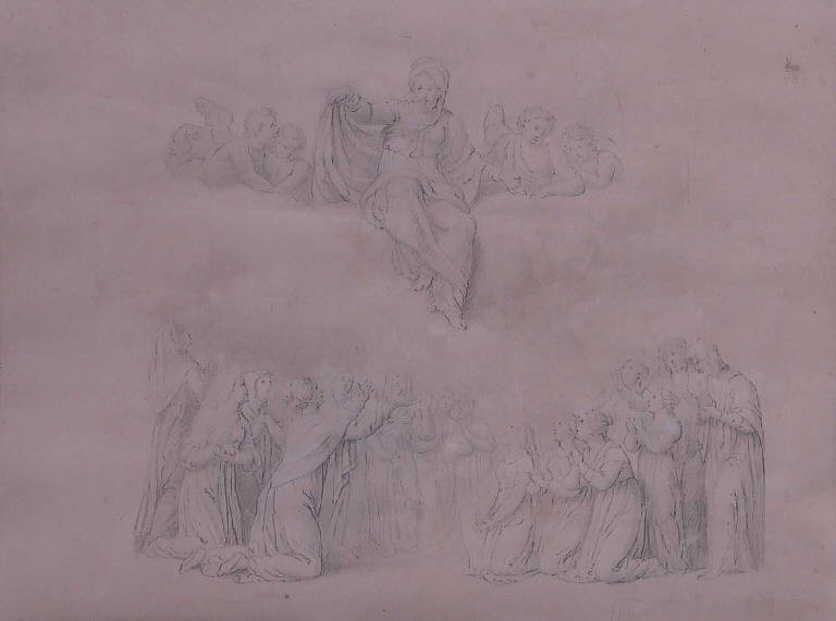 Nella parte alta del foglio, al centro, si trova la Madonna raffigurata seduta sulle nubi, con le gambe rivolte verso destra ed il volto rivolto verso sinistra; accanto a lei vi sono quattro angeli; in basso, disposti a semicerchio, si trovano alcune fanciulle, prevalentemente inginocchiate ed in atteggiamento di preghiera o di adorazione della Vergine.