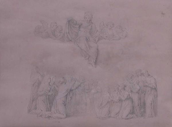 - NOTIZIE STORICO CRITICHE Come il disegno siglato D000147, anche questo è da considerare uno studio preparatorio per l'insieme dell'affresco situato sul lato destro del presbiterio del Santuario della Beata Vergine di Caravaggio a Chiari, realizzato dall'artista nel 1827. In questo disegno, si notano le stesse finezze grafiche e la freschezza di impostazione che si scorgono nell'altro disegno; in più "è riconoscibile lo studio della cornice e la ricerca distributiva dei gruppi all'interno dello spazio prestabilito" (Terraroli, 1991, p. 46). Rispetto all'affresco il disegno mostra minore rigidità e una morbidezza nella costruzione delle figure che nella traduzione pittorica si è in parte persa a vantaggio di una pittura più raffreddata nei toni e nei passaggi chiaroscurali, di chiaro impianto neoclassico.