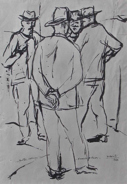 - NOTIZIE STORICO CRITICHE Scena dall'impaginazione essenziale ma registicamente ben studiata, capace di rendere l'aggregarsi e il disgregarsi di gruppetti di uomini in giorno di mercato. Le quattro figure, tracciate con pochi tratti di china larghi e succosi, paiono riportare alla mente analoghe prove che rimontano ancora alla fine del secolo precedente e che prendono le mosse dalla graffiante capacità caricaturale di Toulouse Lautrec.