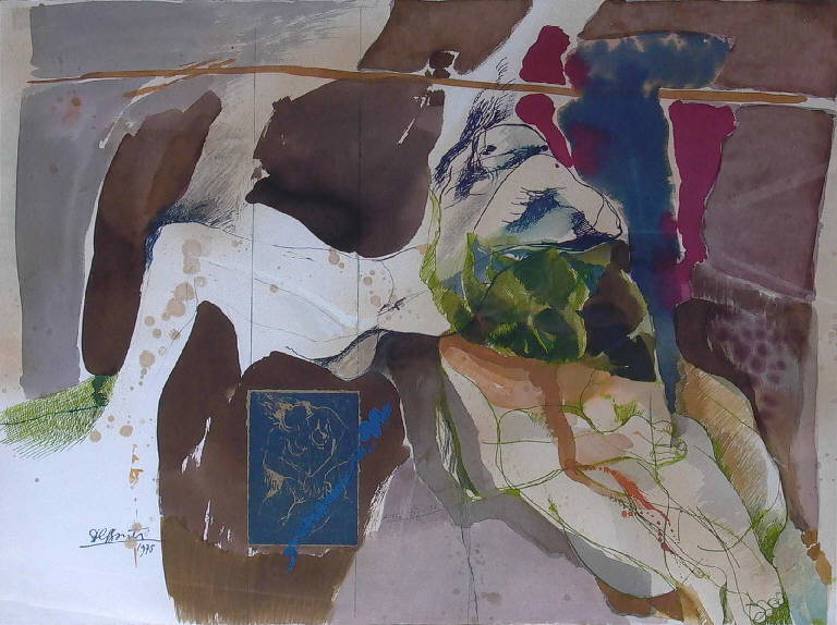 - NOTIZIE STORICO CRITICHE Le tre figure evocate dal titolo sono risolte in questa carta colorata attraverso un robusto intreccio di linee e di colori che sottolineano l'interna connessione tematica e sviluppano ulteriormente il tema della moltiplicazione dei piani virtuali possibili anche sulla superficie piana della rappresentazione pittorica. L'amplificarsi dell'impiego dell'inchiostro colorato, steso in larghe superfici, conferisce un senso più sodo all'intera raffigurazione. Di particolare intensità la figura realizzata come in negativo entro un rettangolo blu che pare avvicinabile al realismo di Guttuso.