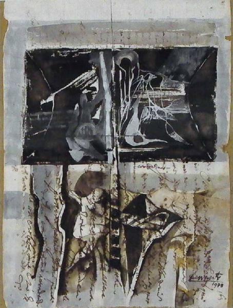 - NOTIZIE STORICO CRITICHE Lo sbilanciamento verso l'astrattismo concreto ha in quest'opera, come in quelle realizzate in questo giro di anni, uno dei suoi risultati migliori. la filigrana della carta antica funge da supporto per un moltiplicarsi di piani visivi popolati da forme riconducibili solo per assonanza a oggetti reali e della vita quotidiana. Piuttosto (e grazie all'approfondirsi del senso cromatico che inclina verso toni bruni e quasi monocromi) si nota una semplificazione delle forme che accentuano il carattere evocativo ed esemplare della rappresentazione, capace di reggersi senza il diretto rapporto con quanto viene messo in scena.