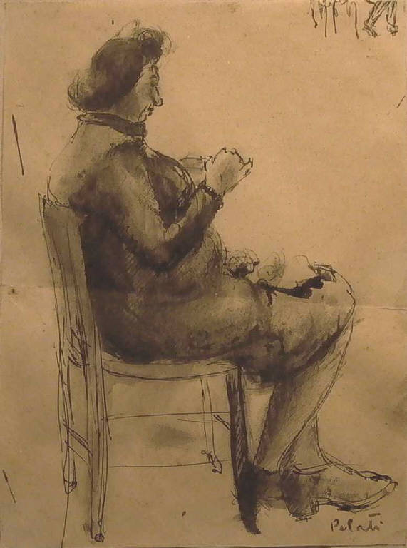 - NOTIZIE STORICO CRITICHE Trattato come uno schizzo bozzettistico il disegno mostra la moglie dell'artista seduta, intenta a confezionare vestiti per il bambino che porta in grembo. Un bozzetto veloce che spia l'intimità familiare, reso con tratti semplificati e mossi.