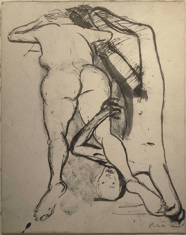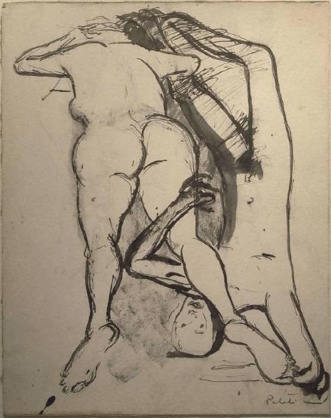 - NOTIZIE STORICO CRITICHE Attribuibile all'attività dell'artista verso l'inizio degli anni Settanta, questa china mostra caratteri assai simili allo Studio per crocifisso (inv. n. ***) per la resa semplificata delle forme e la morbidezza del modellato. Le due figure, segnate solo attraverso in contorno spesso e sfrangiato, aumentato in pochi luoghi da segni di china diluita stesa a pennello, sono poste in forte scorcio e realizzate con estrema libertà. Echi della cultura figurativa contemporanea, da Martini a Guttuso, sono ben visibili nel trattamento semplificato, eppure un po' opulento, delle figure, specie di quella femminile.