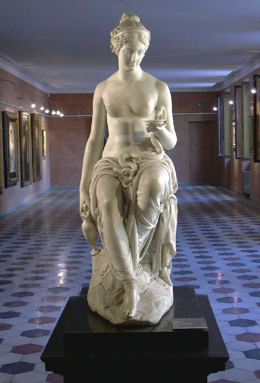 - NOTIZIE STORICO CRITICHE Opera della maturità dell'artista ravennate, ritrae la figura mitologica di Igea, figlia di Asclepio, che, tenendo una patera nella sinistra, lascia che un serpente, simbolo dell'arte medica, vi si abbeveri. Secondo Terraroli (1991, p. 77) l'artista avrebbe fuso qui, insieme alla figura di Igea anche quella di Ebe, coppiera degli dei, figlia di Giove, a motivo della presenza della piccola brocca contenente l'ambrosia tenuta nella destra della donna. \nIl pezzo, proveniente dalla collezione dell'avvocato Pietro Bartolomeo Repossi, è sicuramente il più aderente ai dettami neoclassici perseguiti dal Monti, discepolo del Canova; il modellato morbido e levigatissimo, il panneggio fluente ma senza alcuna ridondanza, il viso dal limpido profilo classico sono altrettanti elementi che mettono in luce, oltre alla perfezione tecnica, la purezza dell'invenzione e la capacità di allineamento dell'artista su stilemi cari alla cultura del classicismo italiano senza, per questo, scadere nella fredda retorica di tanta scultura del periodo. La fragile morbidezza della figura e il suo fiorire, quasi, dal panneggio che avvolge la parte inferiore del corpo lasciando scoperta tutta la parte superiore, ha fatto pensare a una sorta di emulazione della Paolina Borghese del Canova, "viva e allo stesso tempo algida e lontana, come attingesse alle fonti dell'ideale" (Terraroli, 1991, p. 77); tuttavia proprio questa idealizzazione delle forme e un certo, volutamente non celato, tributo al maesto, fa pensare a una dipendenza almeno psicologica (oltre che, in qualche caso, di forme) dalla Ebe, altra opera celeberrima dello scultore di Possagno.
