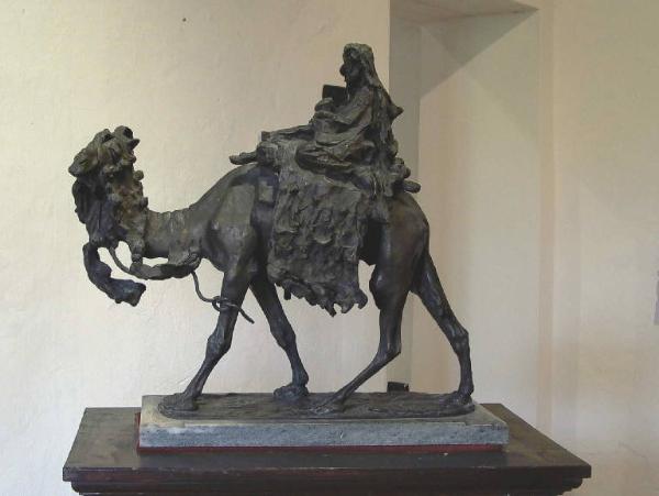 - NOTIZIE STORICO CRITICHE Collocabile nei primi anni del Novecento questo bronzetto è giunto alla Pinacoteca Repossi per lascito della contessa Lucrezia Mazzotti Faglia. Il modellato vibrante e l'andamento bozzettistico della conduzione dell'opera fanno sì che questa inconsueta maternità ambientata, secondo il gusto orientalistico dell'epoca, in contesto beduino, sia restituita a una freschezza quasi spontanea che l'artista riesce a sganciare da un troppo insistito sentimento verista per consegnarla, attraverso la resa sfrangiata del modellato, a una sorta di palpito impressionistico della materia che ricollega talune opere dl Bazzaro da un lato alla scultura disgregata della Scapigliatura e per altre alla sodezza delle soluzioni monumentali prodotte dal Grandi.