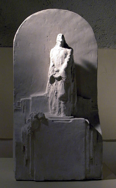 Sullo sfondo di un muro centinato si staglia una figura maschile isolata e con il volto alzato a guardare il cielo; indossa una lunga veste.