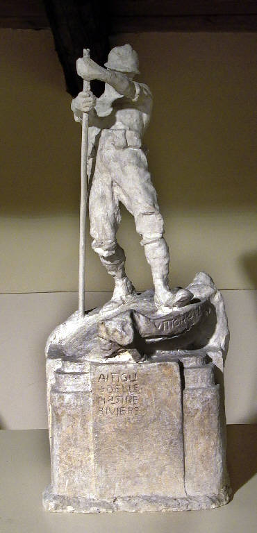 - NOTIZIE STORICO CRITICHE Sviluppo dell'idea già tentata in un altro bozzetto (inv. n. S00043) nel quale figura il soldato sulla barca e la medesima scritta VITTORIO VENETO, questo lavoro mostra una notevole riduzione dell'elemento monumentale in senso spaziale, a tutto vantaggio della concentrazione sulla figura del soldato-nocchier. Questi, eretto sopra la piccola barca fa mostra di remare con energia. Il gesto teso e la muscolatura enfatizzata sono occasione per l'artista per un'indagine psicologica e chiaroscurale di grande effetto. Il bozzetto è assai prossimo alla versione definitiva pure conservata presso la Pinacoteca Repossi (inv. nn. S00047 e S00072).