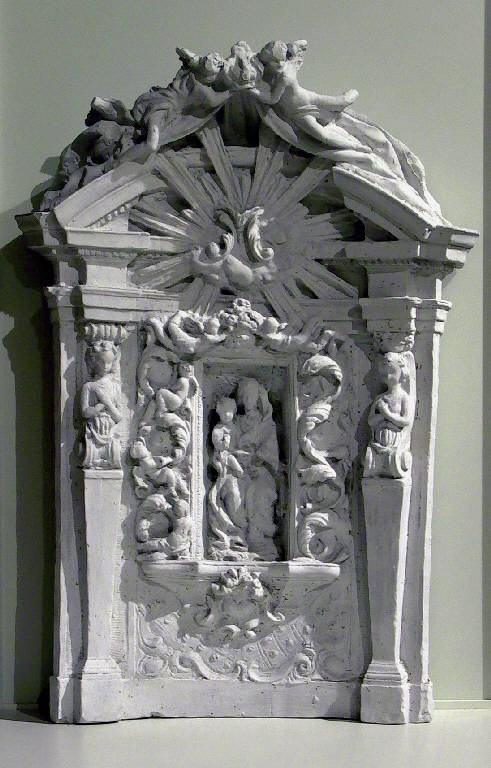 Al centro di un altare, incorniciate da volute d'acanto e da putti in volo vi sono le statue della Madonna con il Bambino.