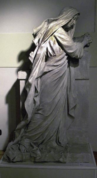 - NOTIZIE STORICO CRITICHE La figura, avvolta in un ampio panneggio dalle falde svolazzanti, è raffigurata in atteggiamento dolente, appoggiata a un semplice monumento funebre. I ricordi canoviani sono qui reinterpretati secondo il linguaggio più mosso e chiaroscurale dell'accademia di secondo Ottocento. I caratteri di chiara derivazione classicista sono, comunque, assimilati entro uno stile personale e di grande vigore comunicativo, attento all'acuirsi della vena sentimentale e quasi simbolista della contemporanea scultura monumentale.