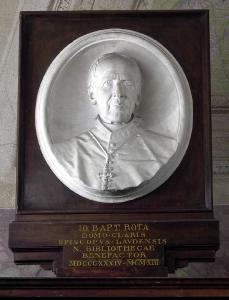 - NOTIZIE STORICO CRITICHE Pendant del numero S00292, raffigurante don Luigi Rivetti, questo medaglione in gesso con l'effigie del vescovo Giovanni Battista Rota è da assegnare alla mano di Antonio Ricci e fu realizzato (stando alla scritta che corre alla base dell'altorilievo di Rivetti) su iniziativa dell'allora bibliotecario Pier Giuseppe Lancini. La figura del vescovo clarense è trattata secondo i canoni encomiastici tipici della scultura ricciana con particolare attenzione alla resa dei particolari fisiognomici.