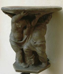 Tre putti in posizione varie ed instabili, ad imitare passi di danza, sorreggono un vassoio.