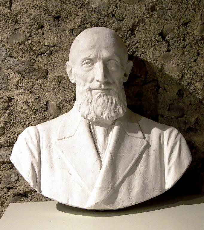 Busto ritratto di Bernardino Varisco; indossa una giaca con cravatta; privo di capelli, ha la barba lunga e riccia.