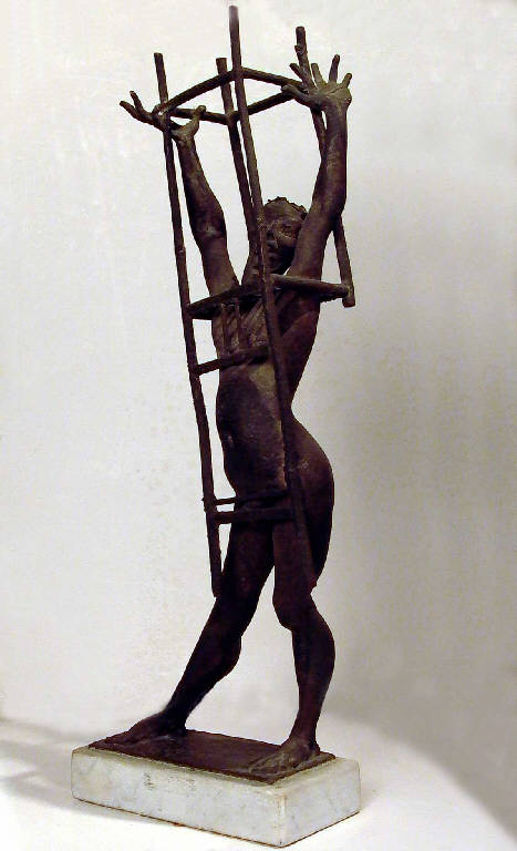 Figura maschile nuda con in corpo incurvato a sinistra e le braccia tese verso l'alto; dal bacino in sù il corpo è chiuso entro una gabbia da cui cerca invano di liberarsi.