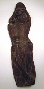 Figura maschile seduta, protetta da corazze e dal volto sofferente.