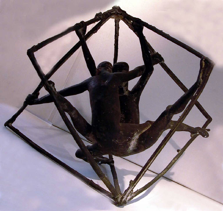 - NOTIZIE STORICO CRITICHE Assai vicino per ispirazione ai Giocolieri nel trapezio (inv. n. S00104), questo bronzetto sviluppa lo stesso tema e propone un'organizzazione spaziale del tutto coerente. La ricerca dell'artista si muove qui non nel campo dei rapporti materni, ma in quello interpersonale più lato e immagina i due personaggi quasi all'interno di un aereo ring nel quale si svolge il match della vita. Sensibile e frammentata la conduzione delle sbarre del trapezio; più morbido e leggero il modellato delle figure. Questa scultura è giunta in Fondazione per dono della sig.ra Serena Casati di Milano, in ricordo del marito.