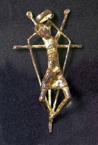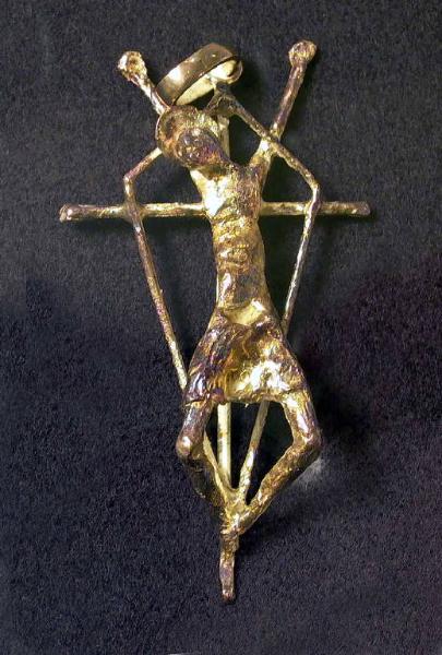 - NOTIZIE STORICO CRITICHE La piccola figura del Cristo, ridotta plasticamente a poche linee essenziali che, comunque, non tolgono nulla alla esasperata posa sofferente, è inscritta all'interno di un rombo irregolare segnato dalla presenza della croce. I due elementi geometrici servono a dare maggiore rilevanza alla morbida tensione della figura che nella posa sembra richiamare da vicino (nell'allungamento della forma e nelle gambe aperte) il Pastorale di papa Palo VI, realizzato in quegli anni da Pericle Fazzini.