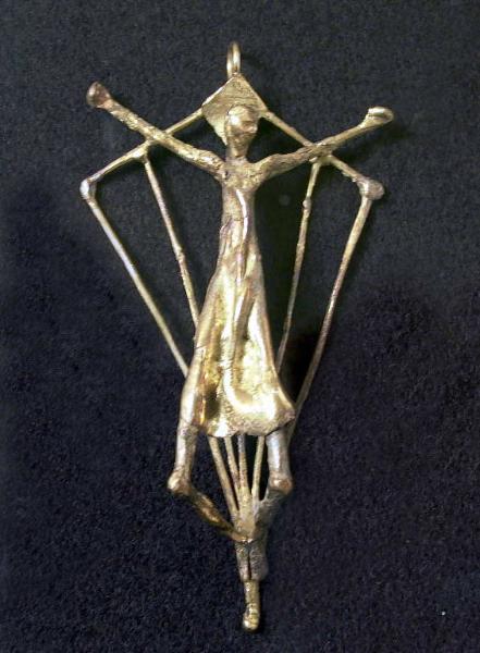 - NOTIZIE STORICO CRITICHE Complessa e raffinata questa piccola fusione non raffigura un Cristo crocifisso ma un Cristo risorto anche se, nel percorso dell'artista, è possibile considerarla il punto di arrivo di una serie di piccole sculture che hanno come tema la figura del Cristo. Qui il Risorto, a braccia allargate, è rivestito di una lunga tunica svolazzante. Fa da sfondo una figura geometrica, approssimativamente romboidale, che funge da inquadramento al personaggio e che ne dilata le proporzioni. Il modellato semplificato e morbido, privo di qualsiasi particolare, dona una singolare forza a questo piccolo manufatto.