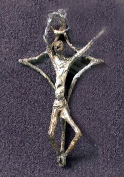 - NOTIZIE STORICO CRITICHE La piccola fusione in argento riprende da vicino un'altra piccola opera di Pelato (inv. n. ***) dove la figura del Cristo a metà tra crocifisso e risorto, si staglia su una forma vagamente romboidale, e fa parte di una serie di piccoli lavori di oreficeria destinati ad essere utilizzati come pendagli. Anche qui la posizione non può che ricordare quella del Cristo del Pastorale di papa Paolo VI, la quale, tuttavia, subisce una ulteriore semplificazione e una riduzione delle forme a semplici entità geometriche.