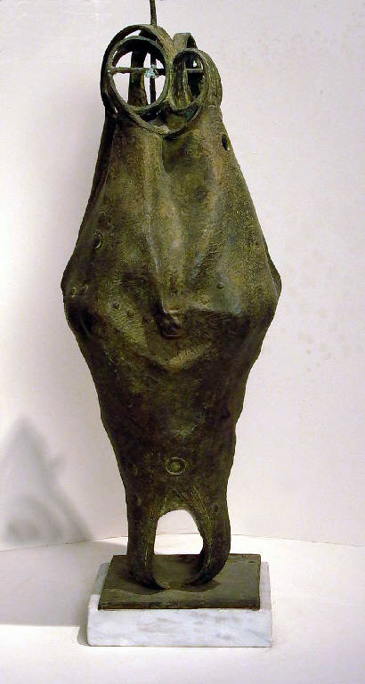 - NOTIZIE STORICO CRITICHE Come per la scultura Le anime (inv. n. S00117) Pelati utilizza per questo bronzetto un linguaggio distante dall'approccio figurativo preferendo avventurarsi sul terreno dell'astrazione. Rispetto all'altro pezzo, però, risulta qui più convincente perché, attraverso l'impiego di un modellato più morbido e di elementi proteiformi che lasciano indovinare - quasi si fosse in presenza di pesanti cappe - membra umane, procede secondo un linguaggio a lui più congeniale e vicino a quanto stava allora sperimentando.