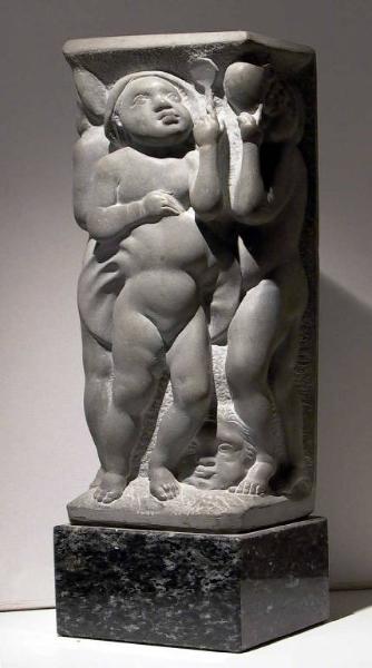 - NOTIZIE STORICO CRITICHE La dilatazione della forma che Pelati utilizza talvolta nelle sue sculture più tarde, tornando anche al bassorilievo, sembra riandare con la memoria alle opere di quasi vent'anni prima, ma qui una sorta di nuovo classicismo prende il posto delle suggestioni scabre e neo-romaniche che si coglievano in alcune di quelle prove. Piuttosto qui si nota una riconprensione di opere come i ritratti di Mira (inv. n. S00100) o di Iris (inv. n. S00106) inseriti in un più ampio e respirato ambiente che si allarga alla figura umana intera e che sortisce l'effetto di una maggiore concrezione delle forme che non si concentra più solo sull'evento significativo del volto, ma si allarga a tematiche allegoriche che l'artista tratta rifacendosi a moduli inaspettati quali la scultura del primo Rinascimento fiorentino e, qui in particolare, al Donatello della cantoria per il duomo di Firenze. Il blocco delle Quattro stagioni è un monolite dal quale emergono con forza plastica ampia ma misurata le figure dei puttini di ascendenza classica ma dal forte espressionismo di marca donatelliana, dal modellato levigatissimo che contrasta con la scabrosità del fondo entro il quale sembrano scomparire e riapparire entro i loro fluenti e svolazzanti panneggi.