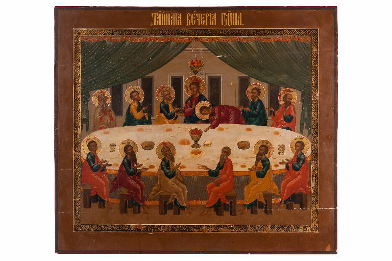 - NOTIZIE STORICO CRITICHE Il soggetto dell'Ultima cena, prediletto soprattutto dall'arte occidentale, vede intrecciati i temi biblici dell'istituzione dell'Eucaristia e del tradimento di Giuda.\nLa nostra icona, della Scuola russa di Mstera, risale all'ultimo quarto del XIX secolo. \nIn una casa-tempio, sotto un grande tendaggio verde, lumeggiato d'oro e orlato di rosso, siedono a tavola Gesù e gli apostoli, seduti su sgabelli lignei.Su di loro, in verticale riapetto alla figura del Cristo pende una lampada dalle grandi rosse fiamme. La rappresentazione è carica di significato: il Maestro, consapevole di essere giunto all'ora cruciale della sua vita, è in preda alla commozione ed è pieno di affetto verso i Dodici che si accinge a lasciare; egli occupa il posto d'onore al centro della lunga tavola ovale; indossa una tunica rossa, segno della sua regalità e un manto blu che dichiara, invece, la sua natura umana. La sua mano destra è levata in gesto benedicente, in cui le due dita ravvicinate richiamano la sua unione ipostatica di Dio-uomo. Il volto di Gesù, leggermente chinato verso destra, esprime dolcezza e malinconia; lo sguardo, mite e intenso, è carico della solennità e della sofferenza per quanto si sta compiendo. Giovanni (il volto sbarbato e i capelli, corti e ondulati, ne indicano la giovinezza), seduto alla sinistra di Cristo, è piegato con il capo sul cuore di Gesù, che lo abbraccia con la mano sinistra: entrambi esprimono affetto incondizionato. Pietro si trova alla destra del Maestro con le mani e lo sguardo rivolti a Gesù; i suoi occhi, incavati, appaiono pieni di tristezza e di amore. In posizione a lui diametralmente opposta è seduto Giuda (senza nimbo), la cui postura rivela l'intimo tormento: se con la mano destra tocca il pane, nella sinistra tiene il sacchetto con i denari del tradimento. Gli altri apostoli, girati di tre quarti verso Gesù, sembrano creare un ritmo musicale con il movimento delle mani: chi le volge in alto, chi le incrocia sul petto, chi le tende verso Gesù. Sulla bianca tovaglia, orlata d'oro, spiccano i pani e, al centro il calice colmo di vino rosso, che è pure il sangue di Cristo. Meravigliosa la cromia della composizione: si notino gli abiti del Cristo e degli apostoli, con panneggi coloratissimi; il candore della tovaglia, orlata con bordi verdi con graffito in foglia d'oro, i colori brillanti del pane, del calice con il vino. Anche i nimbi sono in g foglia d'oro; quello di Cristo è crociato e contiene le sacre lettere O On (io sono colui che sono). All'interno dei nimbi degli apostoli è iscritto il loro nome. Sopra il capo di Gesù sono scritti i canonici sacri digrammi: Gesù Cristo