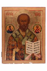- NOTIZIE STORICO CRITICHE San Nicola campeggia su fondo oro, in posizione frontale, nella caratteristica rappresentazione a busto, benedicente secondo il gesto trinitario, mentre con la mano sinistra coperta regge il libro del Vangelo aperto all'inizio della pagina delle Beatitudini. San Nicola è raffigurato, secondo la tradizione, rivestito dei paramenti vescovili ornati di croci; l'omophorion verde, crocesignato, ricade sul davanti. Il volto, circondato da un nimbo d'oro orlato di rosso, è ascetico, con ampia fronte, barba, baffi sottili e grandi occhi ricolmi di spirito contemplativo. Ai lati del santo, in due piccoli medaglioni, appaiono il Cristo e la Madre di Dio, l'uno con in mano il Vangelo e l'altra l'omophorion: è la rappresentazione iconografica del miracolo di Nicea (325): durante il primo concilio ecumenico di Nicea, Nicola, sdegnato per la dottrina eretica di Ario, manifestò la sua vivace opposizione schiaffeggiando Ario; questi se ne lagnò con l'imperatore Costantino, che spogliò delle insegne vescovili Nicola e lo fece incarcerare. Durante la notte però gli apparvero Cristo e la Vergine, in atto di restituirgli rispettivamente il Vangelo e l'omophorion, quasi a simboleggiare una sorta di divina reinvestitura a vescovo e confermando così la vera fede di Nicola. L'episodio dello schiaffo fu aggiunto nella Rus' non più tardi del XV secolo, ma si diffuse poi assai ampiamente. Ai lati del volto di San Nicola appare la scritta in caratteri cirillici in corsivo, a sx: San Nicola e a dx: Taumaturgo, a ricordare i molti miracoli del santo. Sul medaglione con Gesù si vedono, in rosso i due digrammi: IC XC, acronimo ottenuto dalla prima e ultima lettera delle due parole Gesù Cristo, scritte secondo l'alfabeto greco, Iesous Christos; la lettera finale sigma è scritta nella forma lunata che ricorda la lettera latina C); sul medaglione con la Vergine si leggono i due digrammi: MP OY, abbreviazione di Meter Theou = Madre di Dio.