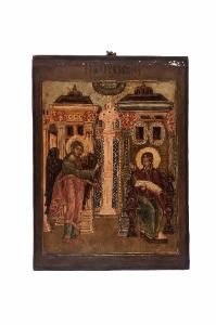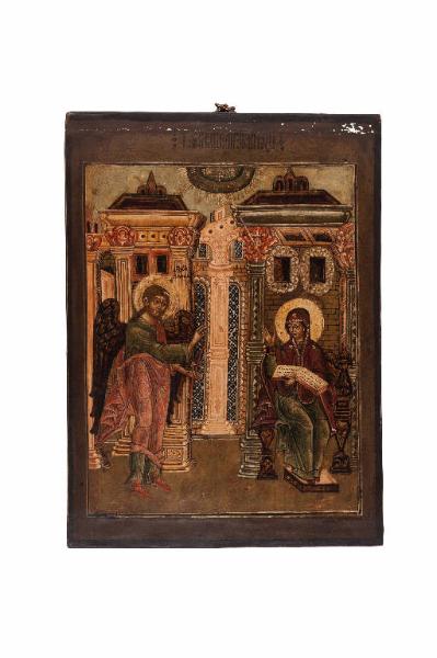 - NOTIZIE STORICO CRITICHE L'iconografia dell'Annunciazione conferma l'importanza della festa, una delle "dodici grandi feste", sempre dipinte nelle iconostasi delle chiese orientali. L'icona dell'Annunciazione del Signore "scrive" la pagina di Lc 1,26-38, pagina che ci introduce nel mistero della salvezza portata all'umanità da Gesù Cristo. L'impianto figurativo della nostra icona è molto sintetico e densamente simbolico: l'arcangelo Gabriele, a destra, sta ritto, di fronte alla Vergine Maria, con un atteggiamento deciso ed equilibrato; il volto, di tre quarti, mostra occhi aperti e bocca chiusa sul mistero della Natività da annunciare; la postura e le pieghe verticali, ben definite, della veste rosso chiaro, rafforzano l'espressione di pace e fermezza: il messaggero è la parola potente di Dio. Con la mano destra, benedicente nel gesto trinitario, Gabriele si indirizza a Maria per salutarla e interpellarla; con la mano sinistra reca una verga rossa, simbolo del suo ruolo di messaggero divino. A sinistra è rappresentata la Vergine Maria, seduta su un trono sontuoso, con i piedi calzati di rosso, che poggiano su una predella: essere seduti significa essere sicuri; avverrà qualcosa di definitivo. La Madre di Dio, in atteggiamento di profondo raccoglimento, vestita di un maphorion di colore rosso vino (il colore della divinità, della regalità), bordato d'oro, e di una tunica di colore azzurro scuro (colore dell'umano) e verde (colore della terra), ascolta l'arcangelo; sul capo e sulle spalle ha tre stelline a fiore che indicano la verginità prima, durante e dopo il parto. I suoi grandi occhi e la bocca chiusa indicano la profondità dell'ascolto, della contemplazione e del mistero, che si riverbera anche nel colore scuro della carnagione (parimenti a quella di Gabriele); la sua espressione esprime il consenso attraverso la testa inclinata, segno evidente della sua umiltà; la mano destra è aperta come gesto di disponibilità e di accoglienza verso il Signore; la mano sinistra regge il Vangelo aperto alla pagina di Lc 1,26-38. Dall'alto, al centro, da un sole d'oro raggiato con all'interno tre stelle (che indicano la Trinità) proviene la colomba -lo Spirito Santo-, il cui raggio scende verso la Vergine. La scena ha come sfondo una grandiosa, sontuosa e fantasiosa architettura, che non rimanda a Nazareth, ma piuttosto al tempio di Gerusalemme; la simbologia architettonica è legata alle metafora con cui la Madre di Dio viene chiamata: "Dimora luminosissima; Palazzo del grande sovrano". I nimbi in foglia d'oro, l'assist finissimo nei raggi e nelle stelle; i particolari a mecca dei tetti, delle finestre, del trono e delle ali dell'Arcangelo impreziosiscono e illuminano la scena.