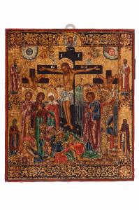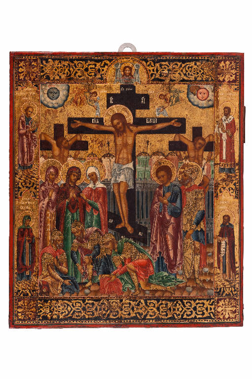 - NOTIZIE STORICO CRITICHE La "Crocifissione di Gesù Cristo" è presente nell'iconografia russa fin dall' XI secolo con la caratteristica forma della croce del tipo ad otto punte, detta anche "croce russa"; tipica è l' inclinazione della traversa inferiore (scabellum pedum) su cui poggiano i piedi del Cristo, il cui corpo non presenta evidenti segni di torture e sofferenze fisiche, mentre nelle Crocifissioni occidentali il Cristo in croce sconvolge con la drammaticità tutta fisica delle ferite sanguinanti e delle membra tese e contratte dal dolore e dal peso stesso del corpo.\nIl nostro esemplare, di Scuola russa (Siberia) del secondo quarto del XIX secolo, mostra ergersi al centro, su fondo oro inciso e bulinato, Cristo crocifisso; il volto, dagli occhi chiusi, reclinato sulla spalla destra e circonfuso da un nimbo crociato d'oro, è sereno: tutto è compiuto; nell'oro del cielo due angeli tendono verso di lui finissimi panni per detergerne il volto; negli angoli le faccine della luna e del sole spiccano fra le nuvole; alla dx e alla sx del Crocifisso sono rappresentate la lancia e la canna con la spugna imbevuta d'aceto, chiari richiami ai testi evangeli della Passio. A destra della Croce di Cristo, quasi nera a rappresentare la morte e il dolore, si ergono le croci, più chiare, dei due ladroni: quello di dx, pentito, rivolge il suo volto pieno di speranza verso Gesù; quello alla sx volge lo sguardo lontano. \nAlla dx della Croce, in piedi, ricoperte dal maphorion e col capo aureolato d'oro, Maria di Magdala e Maria di Cleofa sorreggono la Madre di Dio, che è in atteggiamento di preghiera e di adorazione; a sx Giovanni apostolo reclina il capo, con le braccia incrociate sul petto, in atteggiamento di devozione e contemplazione, mentre il centurione romano Longino, splendido nella sua armatura d'oro, alza il volto verso il Cristo: anche lui ha un nimbo d'oro intorno al capo, simbolo della sua conversione. Nel registro inferiore dell'icona, a sinistra per l'osservatore, tre soldati romani, chini a terra, si giocano ai dadi la tunica rossa di Gesù: da ammire la finissima incisione in foglia d'oro su armature, scudo, calzature. La scena della Crocifissione si erge sullo sfondo del muro e delle cupole del tempio di Gerusalemme; è racchiusa in una cornice, che, in alto e in basso è fitomorfa, incisa e bulinata d'oro su fondo rosso e nero; in alto, al centro della cornice, è dipinto il Mandylion o "immagine di Edessa" (il volto di Gesù "acheropita", cioè non "fatto da mano umana"); a lato, a dx e a sx: i santi Paolo ap., Eudochia, Giovanni ep., e Niphonte Minchs.