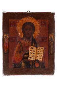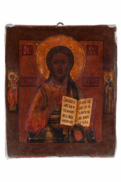 - NOTIZIE STORICO CRITICHE La più diffusa e nota Icona cristologica è quella del "Cristo Pantokrator", (dal greco "che tutto contiene", ma anche "denominatore universale" e "conservatore di tutti gli esseri"; in Occidente viene sovente tradotto con onnipotente), Colui che idealizza la massima gloria e potenza del Cristo, ma esprime anche l'epifania del DIO trascendente che assume fattezze umane. La tipologia del "Pantocratore" nasce dalla fusione dei due tipi fisionomici, ellenico e siriaco, attraverso cui la Chiesa dei primi secoli cerca di raffigurare il Salvatore: caratterizzati l'uno da una bellezza apollinea, adolescenziale (senza barba), l'altro dalla maturità del sapiente, i due tipi si fondano dando luogo ad una sintesi di bellezza, maestà e umanità in cui la Chiesa riconosce il volto di Cristo. Gesù vi è raffigurato, spesso a mezzo busto, in posizione frontale e ieratica col volto intensamente espressivo: con la mano sinistra regge il Vangelo aperto, con le rituali scritte evangeliche, rivolto verso i fedeli; con la destra, secondo il rito Ortodosso/Bizantino, benedice tenendo il palmo della mano aperto ed il pollice e l'anulare congiunti. Nel nimbo le tipiche lettere greche che indicano "Colui che è". \nLa nostra icona, di Scuola della Russia centrale, risale all'ultimo quarto XIX secolo. Su tavola lignea non visibile, perché completamente ricoperta sul retro da velluto azzurro, è raffigurato a mezzo busto, a tempera all'uovo e lacche, con nimbi in foglia d'oro, il Cristo Pantokrator, dall'atteggiamento maestoso e severo. Atemporalità e aspazialità caratterizzano la trascendenza della raffigurazione, sottolineata anche dall'assenza di qualsiasi architettura. Il braccio destro alzato ha la mano atteggiata in modo da indicare con le tre dita unite l'unità e trinità di Dio, e con le altre dita, leggermente arcuate, la duplice natura umana e divina del Cristo; con la sinistra coperta con una parte del suo manto (in segno di rispetto) regge il Vangelo Cristo Pantocratore veste un chitone color rosso porpora e un himation blu, lumeggiati da fine crisografia. Come in tutte le icone di questa tipologia è il Sacro volto la parte centrale, verso cui l'orante è attratto: carnagione scura, ovale appuntito, fronte ampia, baffi e barba appena accennati, lunghi capelli ricadenti sulle spalle con scriminatuta centrale; bocca chiusa sul mistero; naso allungato fino alle sopracciglia ben delineate e occhi bruni grandi, infossati, profondi, misteriosi, severi e compassionevoli insieme. Invita ad inginocchiarsi di fronte al Dio che si è fatto uomo. La scritta, entro cartigli rettangolari, in slavo antico, all'altezza delle spalle, recita: Il Signore "Che Tutto Regge (pantokrator). Il nimbo, che circonda il capo, ha inscritta una croce, in cui spiccano, in greco, le tre sacre lettere O ON (Io sono colui che sono: Esodo 3, 13-14) ; ai lati del nimbo d'oro, orlato di scuro, i sacri digrammi indicanti "Gesù Cristo". Nella cornice scura, che racchiude la raffigurazione centrale, sono raffigurati: (a sx per chi guarda) l'angelo custode e, a dx, il profeta Elia. \n L'icona è impreziosita dall'Oklad in argento sbalzato e cesellato, con punzone di Mosca (Kokoshnik) utilizzato dal 1908 al 1926; saggiatore BR.M o, se latino, GR.M, di cui non si è trovata traccia. Argentiere PS Pavel Samsonov di Mosca, 1899 -1908.