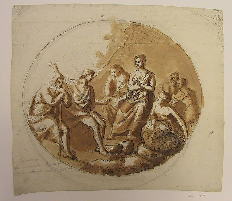 - NOTIZIE STORICO CRITICHE La scena si identifica sicuramente con l'episodio omerico (Odissea, IV), come si deduce dalla scritta autografa e si ritrova identico nel disegno schedato N.I.L. 637. La scritta del verso non è pertinente; Letizia è il nome della moglie di Angelo Ligari.