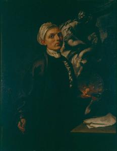 - NOTIZIE STORICO CRITICHE L'età dimostrata dal pittore lascia supporre l'esecuzione durante il periodo milanese tra il 1710 e il 1727. Pietro ligari si raffigura nel suo studio con in testa una cuffia bianca decorata di pizzo: accessorio alla moda tra i pittori suoi contemporanei. \nIl dipinto è ricco di simboli che stanno ad indicare le diverse arti praticate da Pietro: La tavolozza, i pennelli e lo ... simboleggiano la pittura, mentre il compasso e la matita appoggiati sul tavaolino rimandano al disegno e all'architettura. Le arti applicate sono sottintese dalle due figure femminili, che si abbracciano sullo sfondo, una con la squadra, l'altra con il mazzuolo.\nSullo sfondo a destra, in penombra, è possibile individuare un cavalletto, forse lo stesso su cui è appoggiato questo dipinto, cavalletto appartenuto a Pietro Ligari e proveniente dal suo studio.