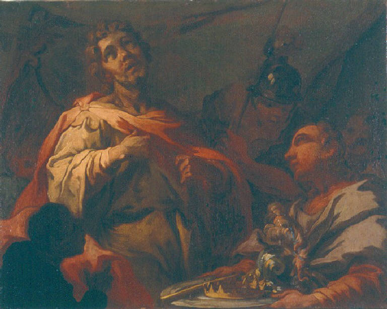- NOTIZIE STORICO CRITICHE Il soggtto del quadro era indicato generalmente come "Scena dell'Antico Testamento", ma più convenientemente può essere identificata con "L'offerta della corona a Davide". Nell'Inventario 1735 Pietro scrive di avere in casa: "Due quadretti senza cornici, istorie di Davide fatte in grande", uno dei quali era stato identificato con questo. La scoperta nel 2000 di due dipinti (118 x 147 cm), aventi per soggetto "L'unzione di Davide" e "Davide che suona l'arpa davanti a Saul", ha fatto cadere questa ipotesi; a meno che Pietro non avesse dipinto più bozzetti relativi alle storie di Davide, ma poi nell'Inventario abbia citato solo i due serviti per realizzare i dipinti di grandi dimensioni. Questi ultimi sono databili intorno al 1717-1720, ed è probabile che anche questo bozzetto appartenga allo stesso periodo.