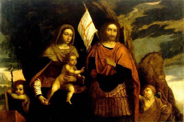 - NOTIZIE STORICO CRITICHE Il dipinto è copia, nello stesso verso, della Madonna con Gesù Bambino e S. Maurizio, affrescata da Bernardino Luini nella lunetta del portale principale della chiesa di S. Maurizio a Ponte in Valtellina. Le figure principali sono identiche, nonostante l'ignoto pittore risulti più ingenuo e bloccato nella resa plastica della delle figure. La copia però è di dimensioni rettangolari e ciò consente all'artista di ambientare la sacra conversazione in uno scenario paesistico, non presente nell'originale.