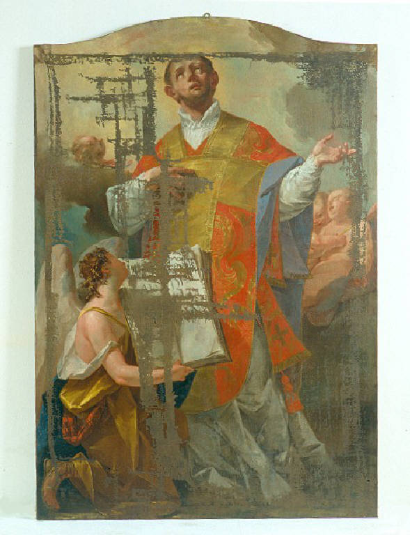 - NOTIZIE STORICO CRITICHE Nonostante le numerose cadute di colore il dipinto presenta strette analogie con l'opera di Cesare Ligari, in particolare con la tela dell'Apoteosi di S. Lorenzo nella parrocchiale di Villa di Tirano, firmata e datata 1750. L'impostazione della figura principale, sebbene con un minore scorcio dal sotto in su, si avvicina a quella del S. Lorenzo, mentre l'angelo in basso a destra è molto vicino all'Angelo annunciante della chiesa di S. Giorgio a Montagna, sempre di Cesare Ligari.