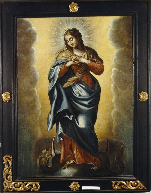 - NOTIZIE STORICO CRITICHE Il dipinto, insieme all'Angelo Custode e alla Glorificazione dell'Eucarestia, sono un deposito della parrocchia di Sondrio ed hanno formato e cornice analoghi. L'iconografia di carattere devozionale e le dimensioni esculdono la funzione di pale d'altare. La tela, insieme alle altre due, è ascrivibile all'ambito lombardo e più strettamente locale. Le molte incertezze disegnative non lasciano dubbi sulla scarsa cultura del pittore locale, che si colloca all'interno di una produzione a carattere devozionale, normalmente ripetitiva. \nL'Immacolata sembra appresentare un momento qualitativamente più felice della produzione del pittore.