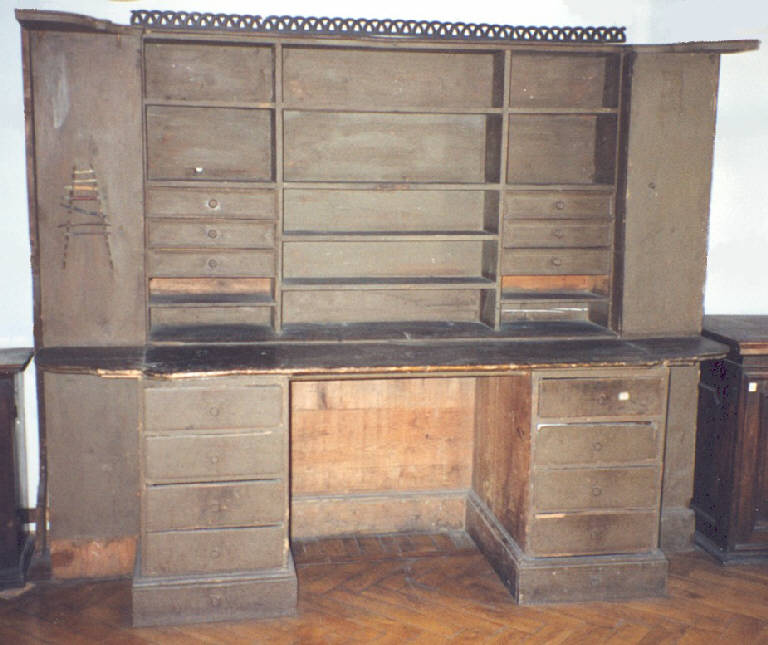 - NOTIZIE STORICO CRITICHE Il mobile in oggetto, di fattura rustica, sembra corrispondere a quello descritto nell'Inventatio 1735: "Una scanzia nova di peccia con sedici cassettini e tavola da scrivere, posta sotto al finestrone del studio". A sostegno di tale ipotesi il fatto che il mobile si trovasse ancora nella collocazione originaria, sotto la finestra grande dello studio, come appare in una fotografia del 1934, prima dello smantellamento dello Studio Ligari..
