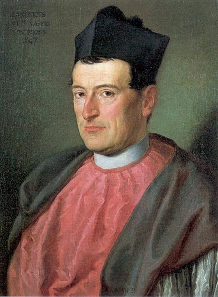 - NOTIZIE STORICO CRITICHE Il ritratto, a mezza figura di tre quarti, presenta con incisività e intensità il volto del Maffei ed è ravvivato dai colori rosso e viola delle vesti sacerdotali. Un confronto con un posteriore ritratto a figura intera dello stesso soggetto, permette di osservare l'assoluta identità dei tratti del volto. E' logico supporre, pertanto, che questa tela abbia costituito il punto di partenza per l'elaborazione del ritratto ufficiale, a figura intera, eseguito qualche anno più tardi.
