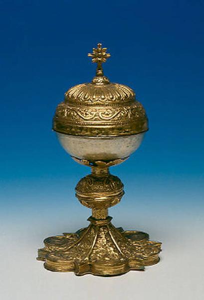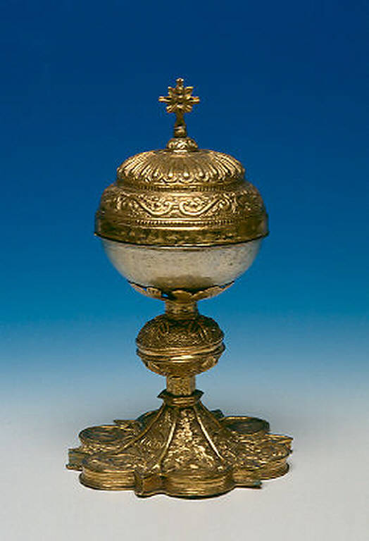 - NOTIZIE STORICO CRITICHE La pisside ha il piede esalobato e tre medaglioni cesellati con figure di santi; il nodo ha forma di sfera schiacciata con motivi di fogliami. Il coperchio e riccamente lavorato e sormontato da una croce, secondo il modello più tradizionale. La pisside è un tipico prodotto di oreficeria comasca del '500.