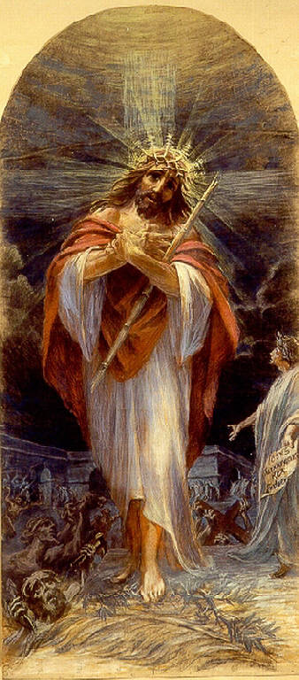 - NOTIZIE STORICO CRITICHE Il cartone è preparatorio per la parte centrale del trittico del Cristo Re nella chiesa di S. Eusebio in Como; l'opera gli venne commissionata da mons. Castelli, assistente dell'Azione Cattolica di Como. Il Cristo è rappresentato in un momento nel quale la sua regalità appare più alta: Cristo deriso davanti a Pilato. Il trittico ora smontato è stato trasferito nella Casa Cardinal Ferrari a Como. Sul bordo inferiore del cartone è riportata una numerazione da 0 a 8 relativa probabilmente alla quadrettatatua per l'ingrandimento. La stesura di velature luminose sulle figure ricorda lo stile del maestro Mentessi e di Previati. \n \n \n \n \n \n