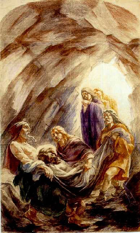 - NOTIZIE STORICO CRITICHE Il cartone è preparatorio per un affresco commissionato da Pia ed Emilio Prandoni a Eliseo Fumagalli per la piccola chiesa del cimitero di Torno (CO). La scena rappresenta il momento in cui Gesù Cristo viene deposto nel sepolcro messo a disposizione da Giuseppe D'Arimatea.