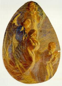 - NOTIZIE STORICO CRITICHE Il cartone è preparatorio per un affresco che decorava l'abside della chiesina dell'Ospedale dei bambini in via Castelvetro a Milano, purtoppo andata distrutta. Gli angeli sono figure celestiali, dipinti in un' armonica gamma di colori, che si stagliano sullo sfondo turchino del cielo. La tecnica di questo cartone è chiaramente ispirata al Divisionismo e mostra come Eliseo Fumagalli, sebbene legato ad una tecnica più tradizionale, conoscesse anche le ultime tendenze dell'arte contemporanea.