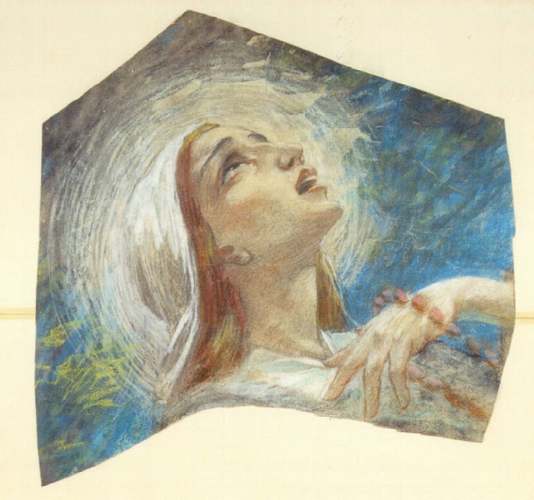 - NOTIZIE STORICO CRITICHE Il cartone è un particolare per l'affresco nella cappella delle Orsoline al secolo che l'artista dipinse ancora giovane in Como. L'affresco rappresenta la Vocazione di S. Angela Merici nel momento in cui Dio la chiama a formare una nuova famiglia religiosa. Sul viso estatico della Santa si coglie la luce dell'ispirazione.